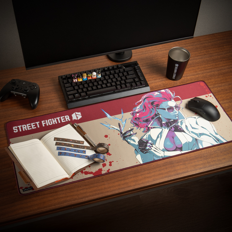 「ストリートファイター 6」とコラボレーションしたデスクマットは、本製品を加えて全29種のラインアップとなりました。横幅80センチ、縦幅30センチの大型デスクマットで、キーボードやマウスの稼働範囲などデスクを広くカバー。厚さ3mmの生地の重厚感により安定性にも優れています。